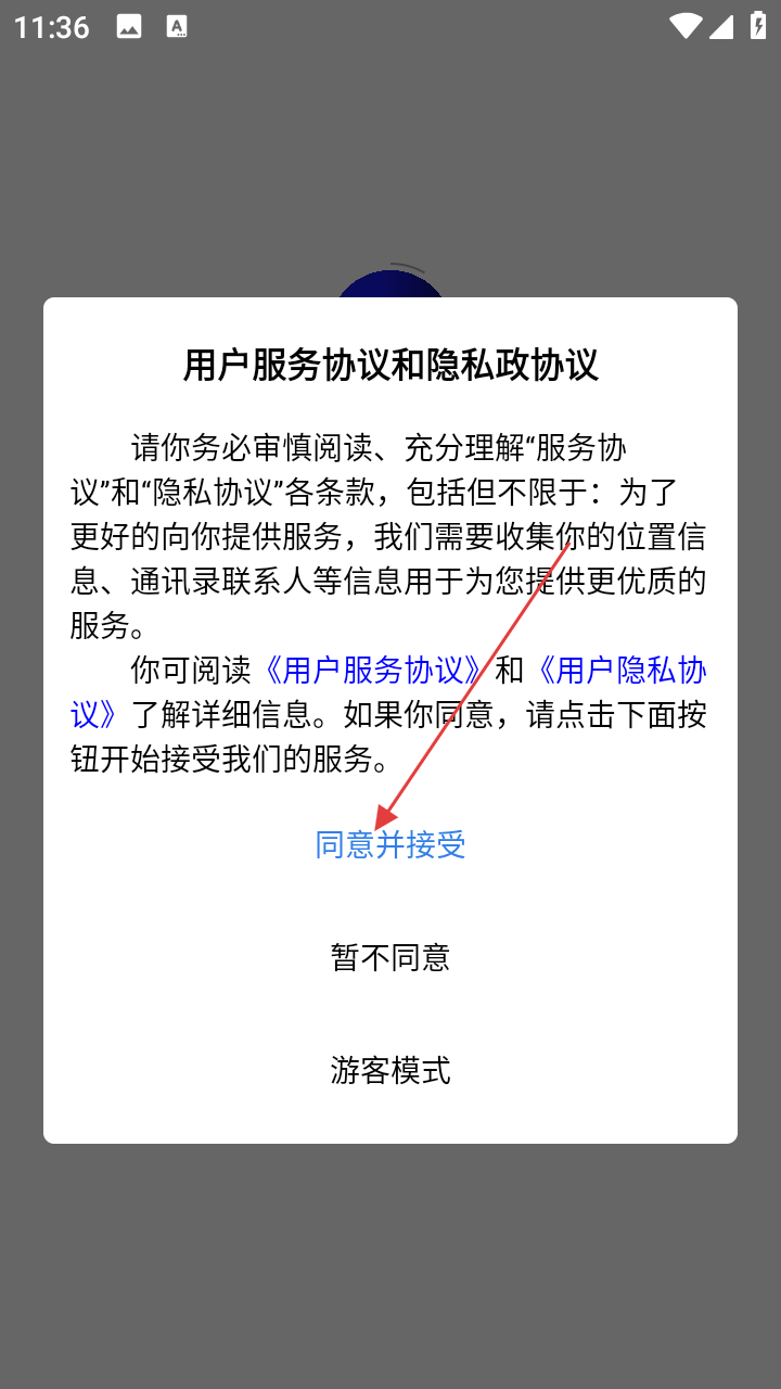 1、首次使用先看协议,点击【同意并接受】,确认服务与隐私条款,开启使用。