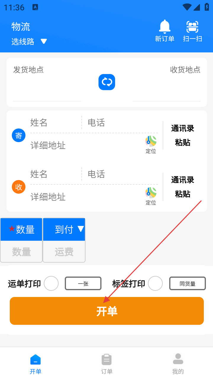 3、信息填好后,核对运单、标签打印设置,点击【开单】,提交物流订单。