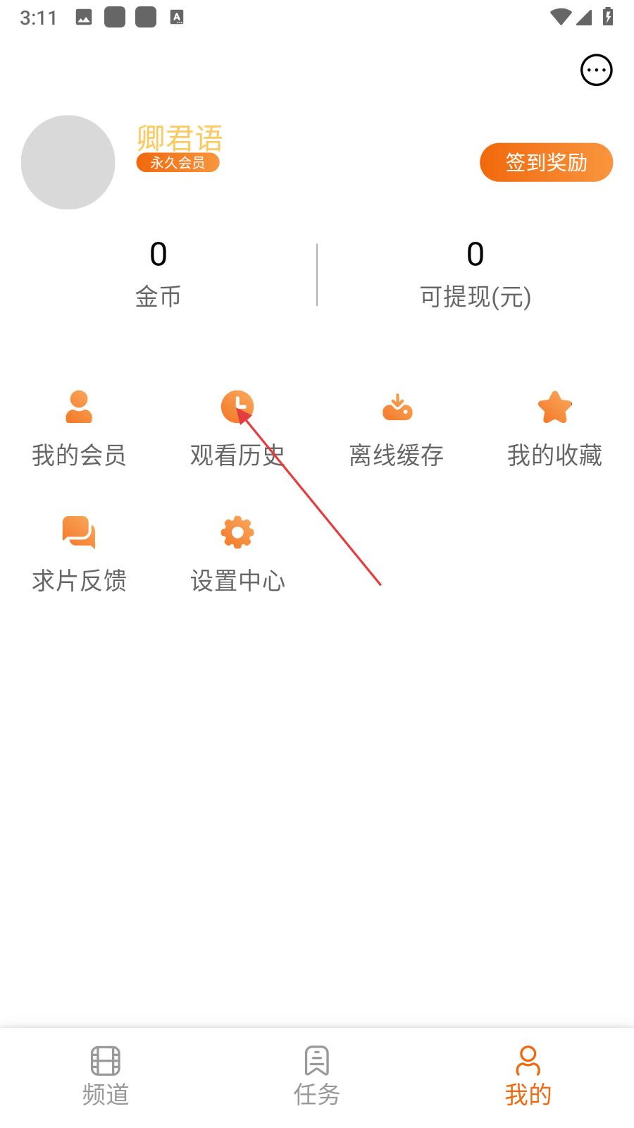 2、在【我的】页面,点击【观看历史】,可进入历史记录界面,查看之前观看过的内容。