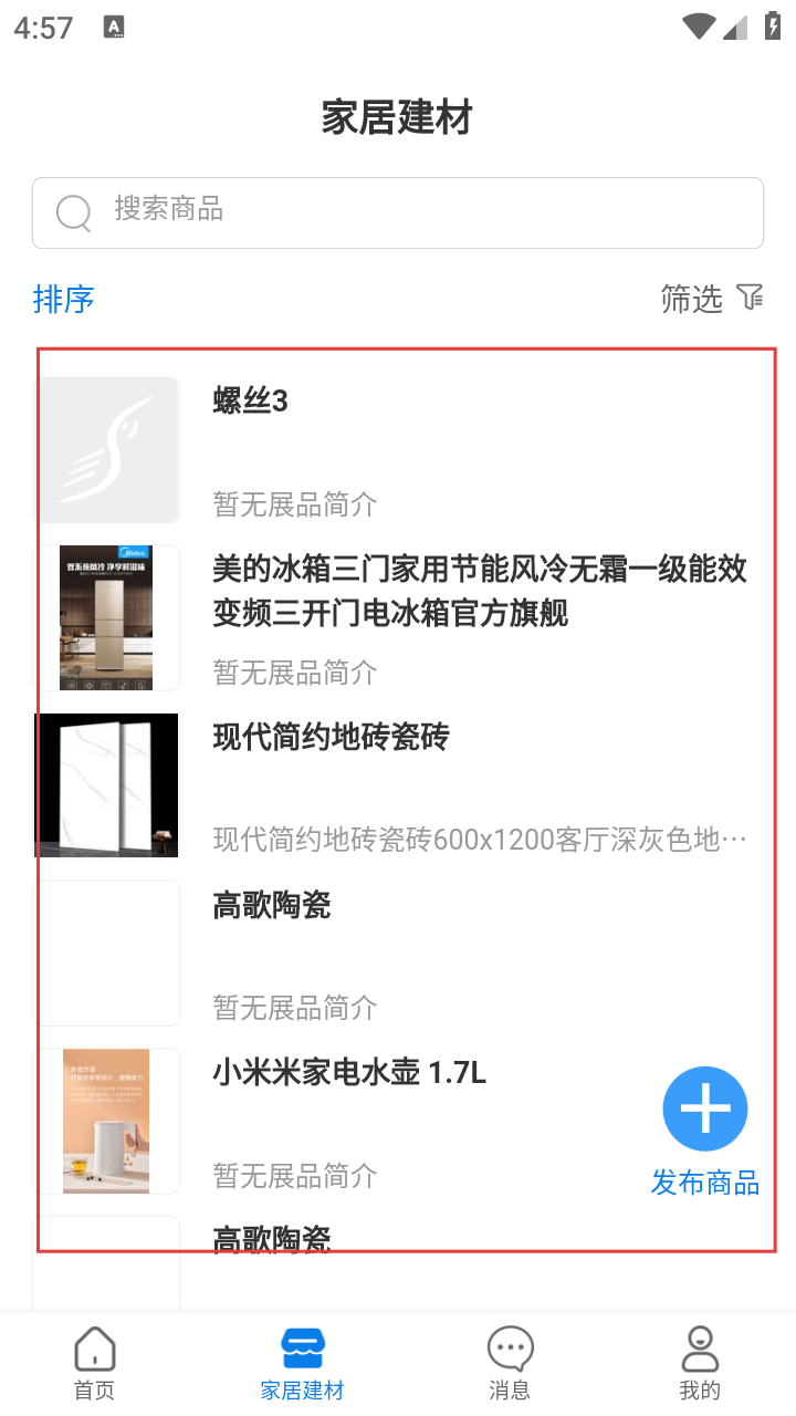 2、进入家居建材页面后,可看到“螺丝3”“美的冰箱三门家用节能风冷无霜一级能效变频三开门电冰箱官方旗舰”等商品列表。
