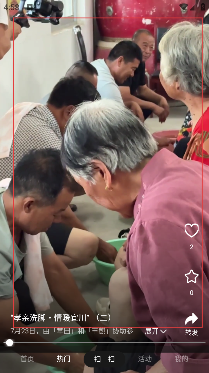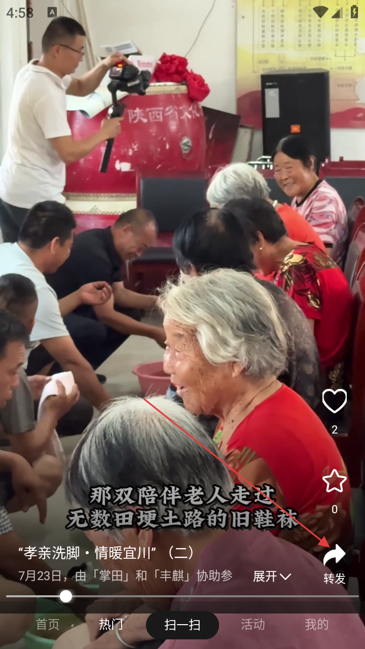3、遇到感人内容,点右下角转发箭头,分享“孝亲洗脚”活动传递善意。