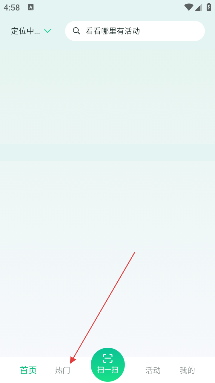 1、想找活动先点【热门】,再用顶部搜索框搜,定位开启能找附近活动。
