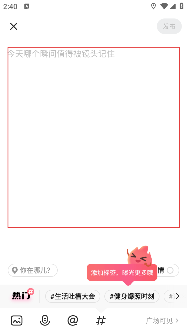 3、在动态编辑页面,输入想分享的内容,还可添加位置、标签等,丰富动态信息。