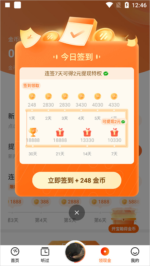 用户签到也可以进行金币领取,连续签到7天后就可以进行提现