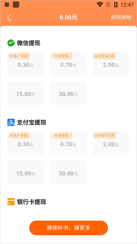 番茄畅听短剧app是一款今日头条官方推出的网文爱好者听书软件,大量正版的小说文集准备好了,畅听不花钱、用户在线听书还能获取现金,完成一些简单的小任务来积累积分,红包达到平台的提现上限,提现规则后就可以使用微信、支付宝或银行卡进行提现。