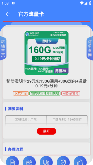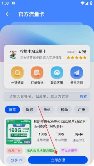 1、打开应用进入首页点击官方流量卡。