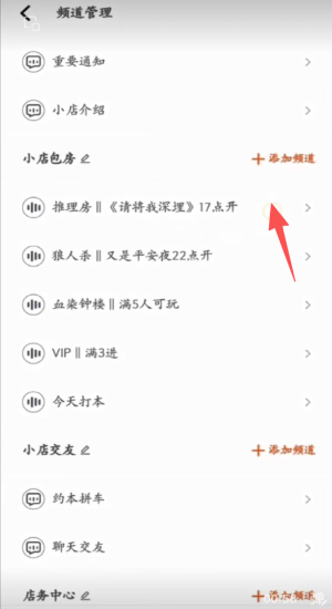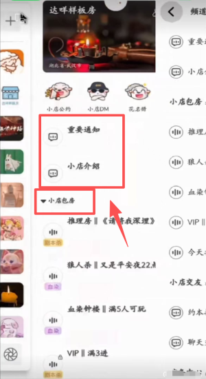 2、在频道区添加“小店包房”与“推理房”,设置狼人杀22点开局。