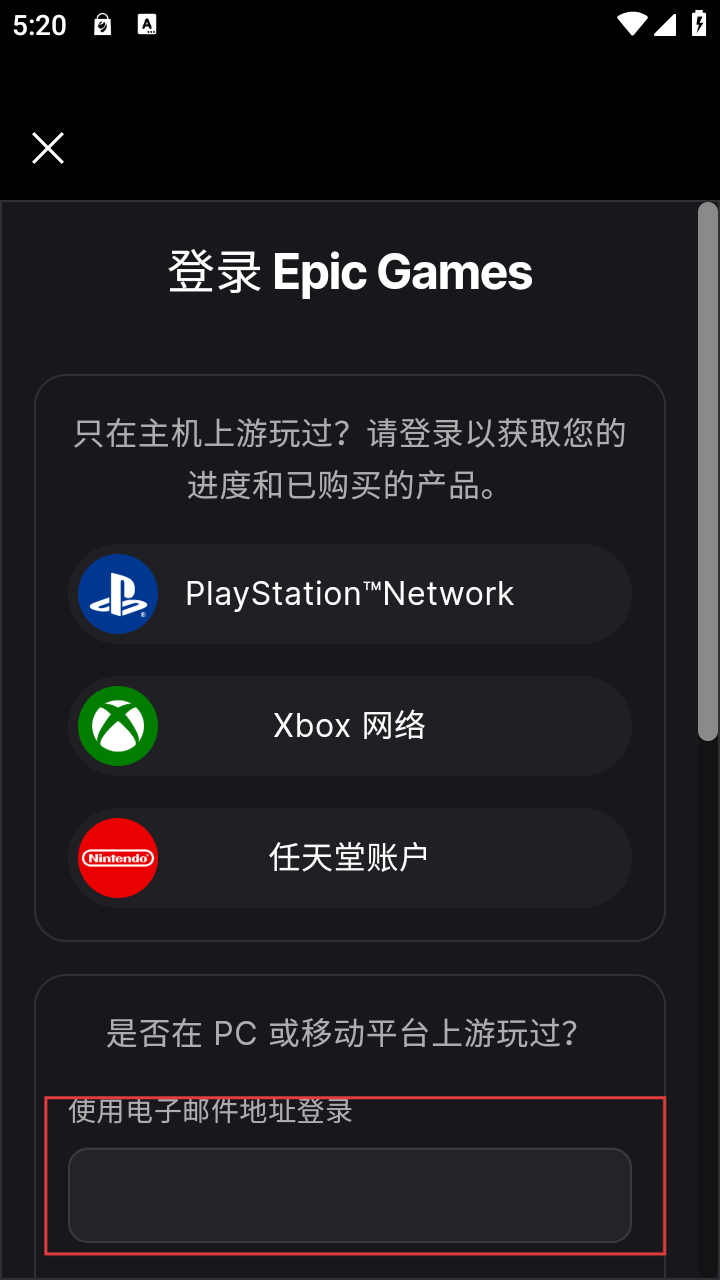 2、在登录界面,可选择【PlayStation™Network】【Xbox网络】【任天堂账户】或电子邮件地址登录【Epic-Games】。