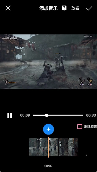 3、点击+添加音乐,可以勾选消除原音,完成后点击右上角按钮保存