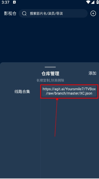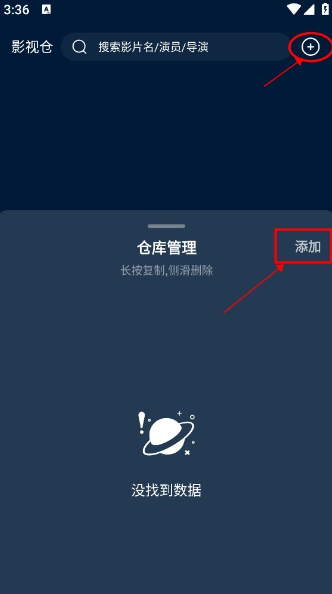 1、进入影视仓软件后,点击上方的+号,然后再点击添加,如图: