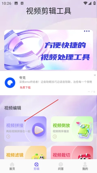 2、进入剪辑页面后,点击【视频拼接】选项,即可进入相机胶卷的视频选择界面。