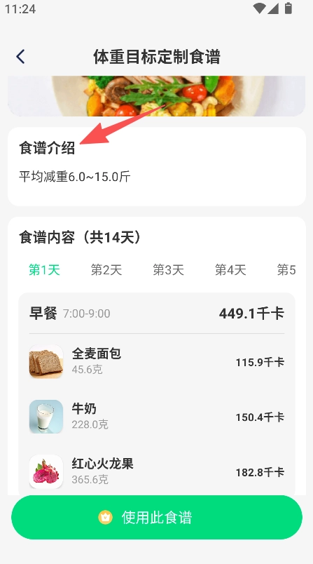 3、选择减重食谱,即可查看体重目标定制食谱的详细内容。