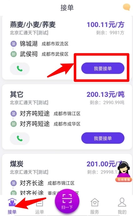 3、在接单界面查看可选订单,点击我要接单可查看详细货物信息和路线。