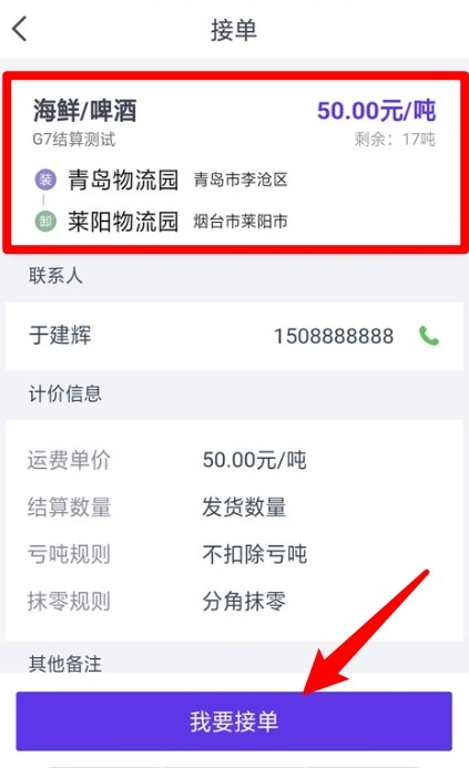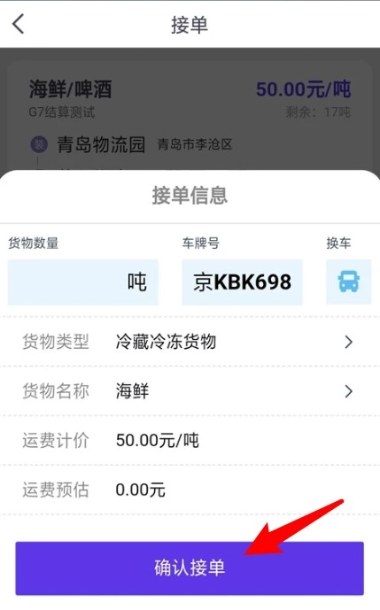 5、填写货物数量与车牌信息,仔细核对订单内容无误后,点击确认接单按钮,即可完成接单流程。