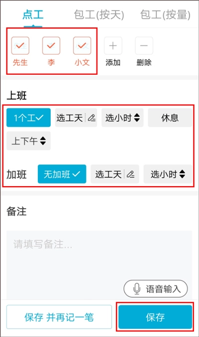 (5)接着选择需要记工的工人,以及对应的上班时长和加班时长,点击【保存】按钮就能完成批量记工操作。