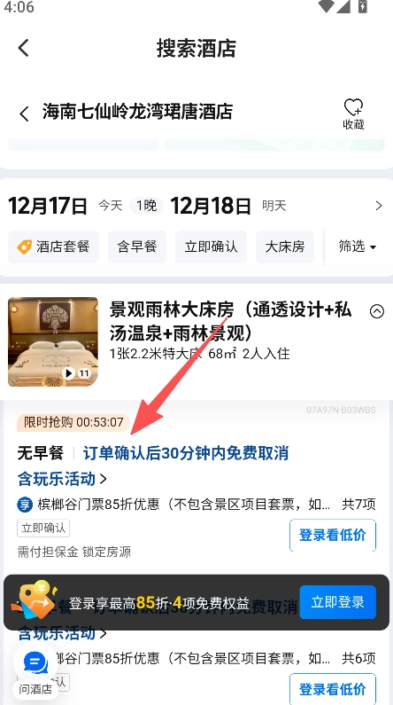 3、酒店详情页展示房型、配套服务、限时活动及取消政策等多维度的详细信息。