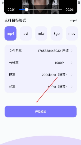 4、在设置页面,确认参数后点击【开始转换】,即可启动视频格式转换流程。