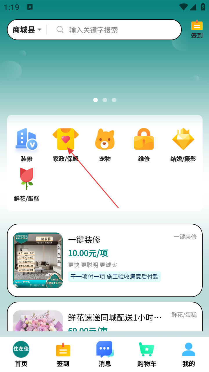 1、打开住在佳,进入首页后点击【家政/保姆】。