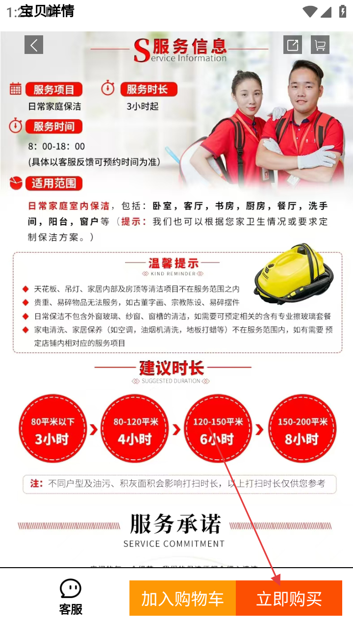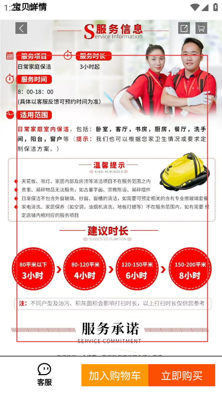 3、进入服务详情页,查看服务项目、时长、时间、适用范围等信息。