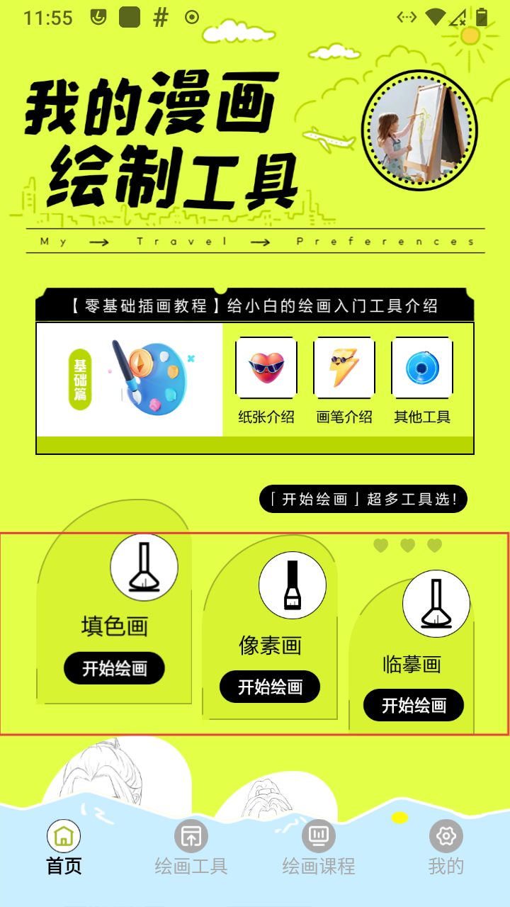 2、打开应用点击打开漫画绘制工具,首页选绘画类型,点击【开始绘画】。