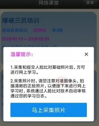 5、选好后,点击【网上学习】进去,出现采集照片的提示,点击【马上采集照片,进行照片采集,如图所示: