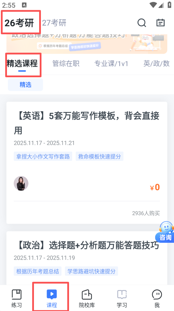 2、切换到 “课程” 页面,选择 “26 考研” 分类,在精选课程板块能浏览适配的英语、政治等备考课程。