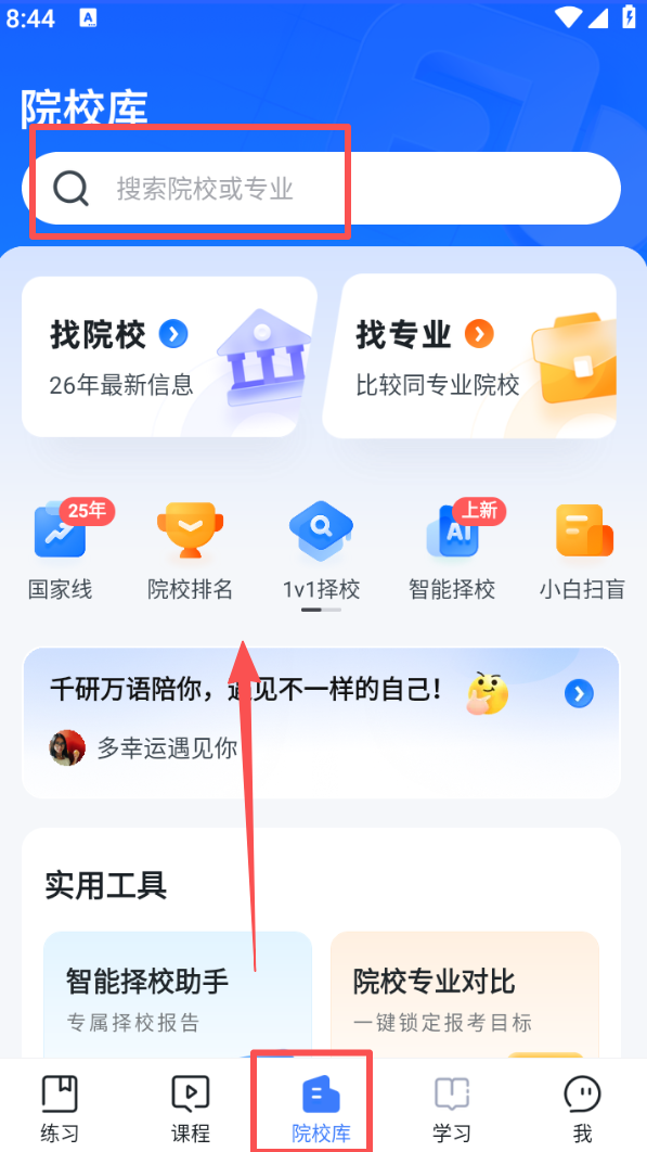 3、打开 “院校库” 页面,通过搜索框查找目标院校或专业,借助 1v1 择校等工具辅助确定报考方向。