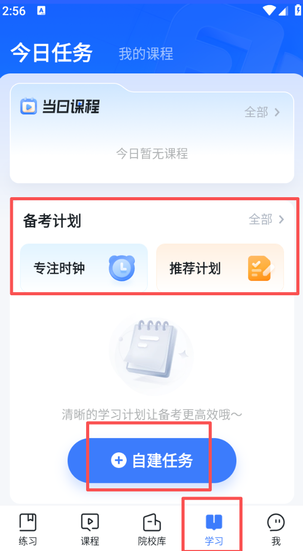 4、进入 “学习” 页面,在备考计划板块点击 “自建任务”,可自主设置学习安排,提升备考的条理度,
