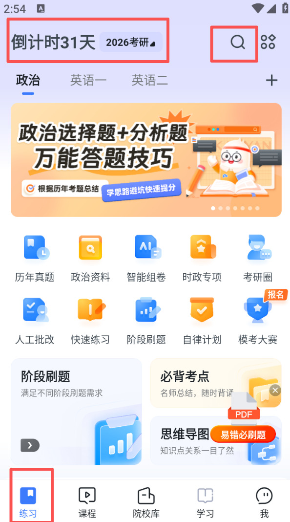 1、进入 “练习” 页面,可在顶部查看考研倒计时,也能通过搜索功能查找对应备考内容,开启刷题准备。