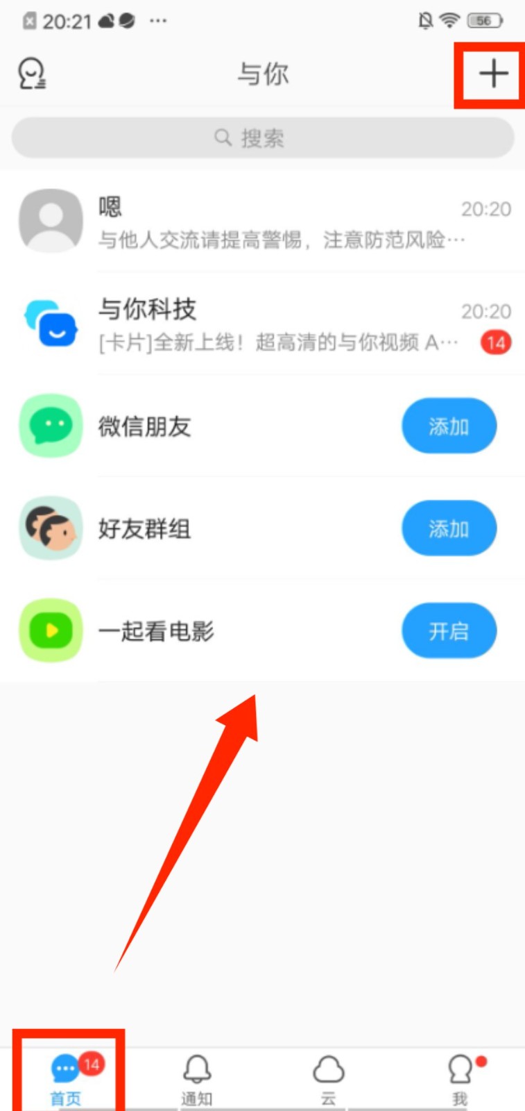1、进入首页,点击右上角 “+” 按钮,可选择添加朋友、创建群组或使用扫一扫功能拓展社交关系。