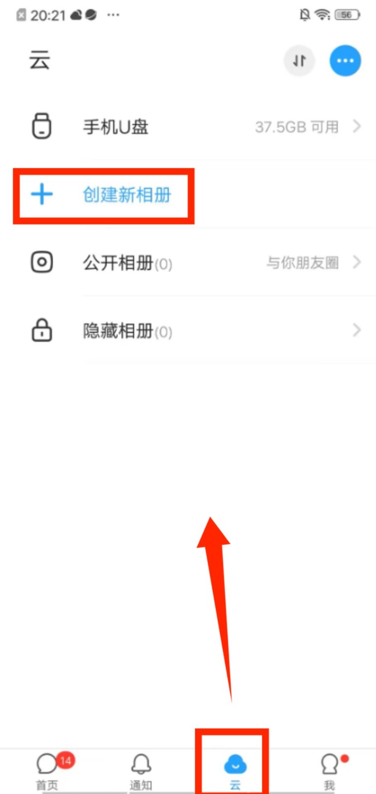 2、切换到云页面,点击 “创建新相册”,能新建存储空间分类管理内容,也可查看现有相册的状态。