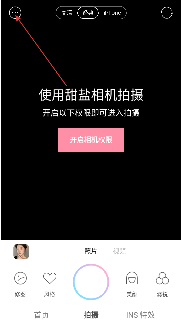 2、进入拍摄界面,若要查看更多功能选项,点击左上角的三点图标。