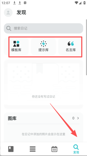 1、访问发现页面,点击“发现”图标,浏览模板库、提示库和名言库。