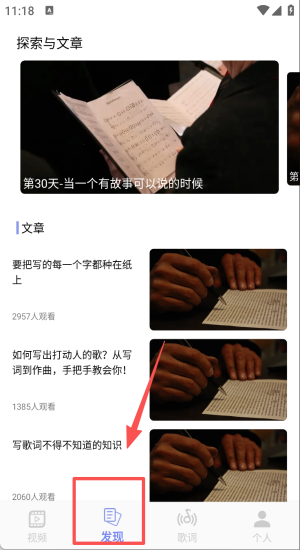 1、在首页点“探索与文章”学写歌技巧,挑篇热门经验先阅读。