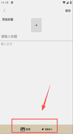 3、在编辑页输入标题正文,点“国图库”选封面,满意后按“保存”。