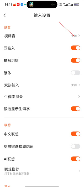 4、在【输入设置】中,可对【模糊音】功能进行开关或模式调整,优化输入体验。