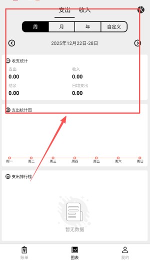 3、自动生成柱状图(月度收支对比)、饼图(消费分类占比)、折线图(消费趋势),支持按周/月/年筛选数据。