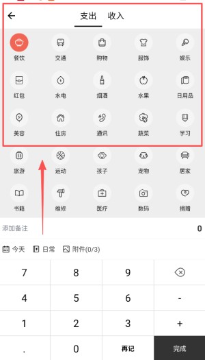 2、在首页,用户可以根据需要快速添加收支明细,选择不同的记账类别,简洁的操作方式帮助快速记录,确保不会遗漏每一笔消费。