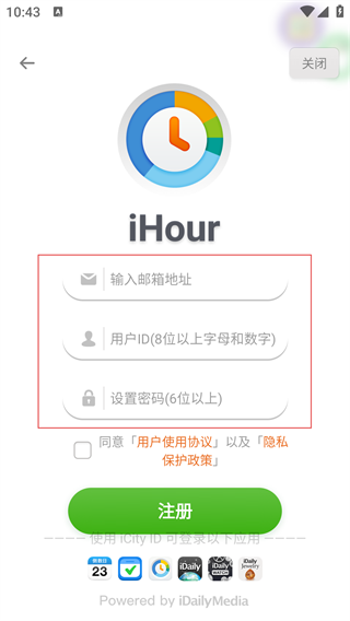 3、注册时,依次输入邮箱地址、8位以上字母和数字组成的用户ID、6位以上密码,勾选同意协议后点击【注册】。
