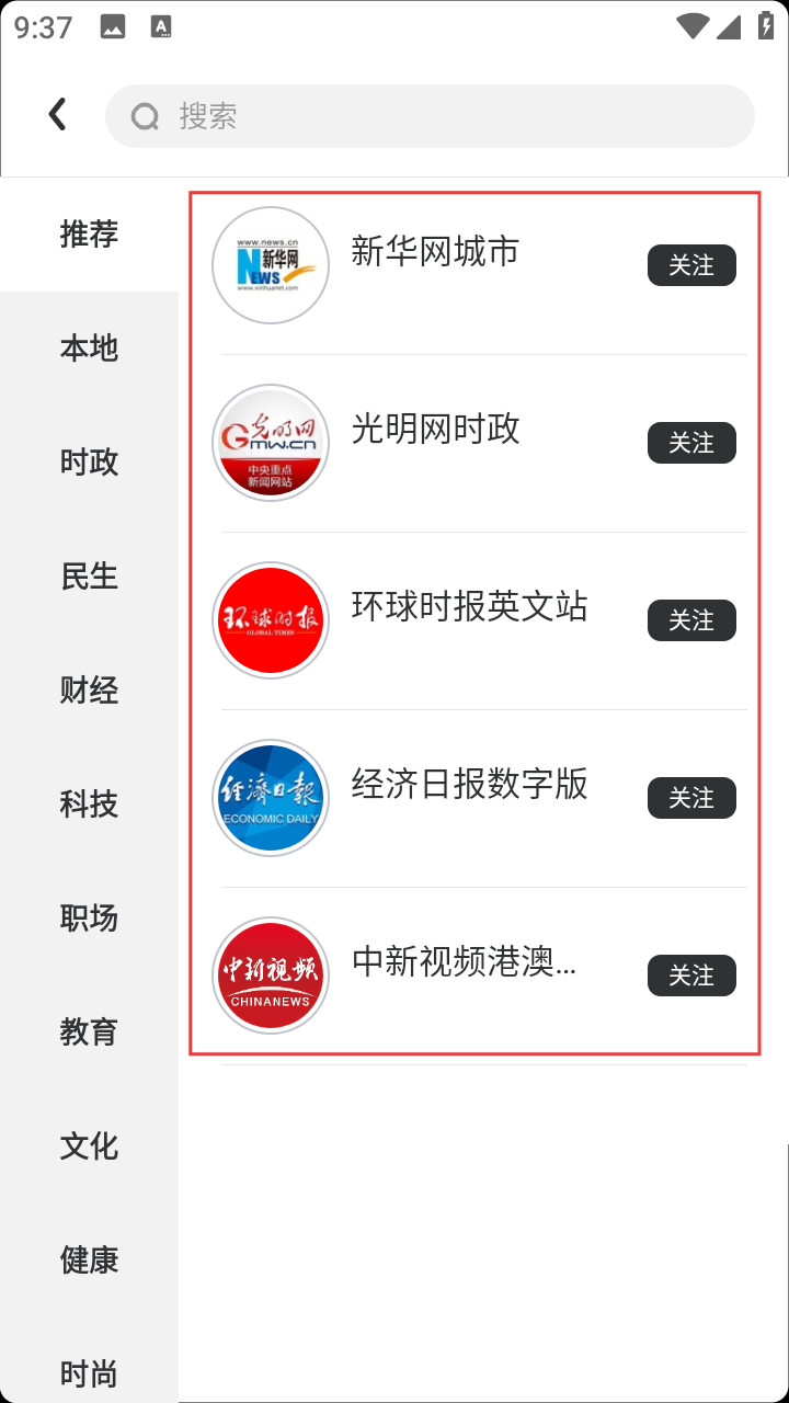 3、浏览推荐的媒体平台,如【新华网城市】【光明网时政】等,选择感兴趣的。