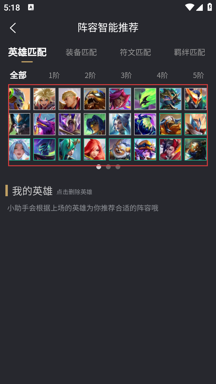 2、在阵容智能推荐页面的【英雄匹配】栏,可查看全部英雄,选择拥有的英雄加入【我的英雄】。