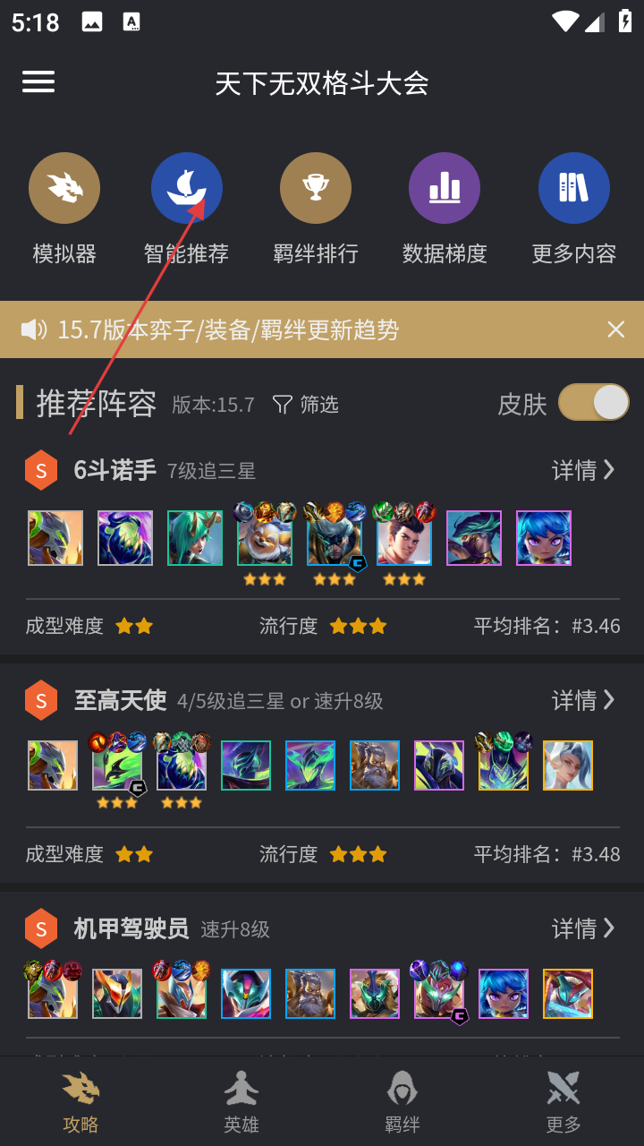 1、在攻略页面,点击【智能推荐】选项,进入阵容智能推荐页面。