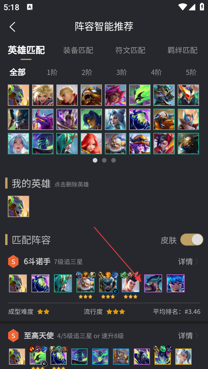 3、系统会根据【我的英雄】匹配出合适的阵容,如点击【6斗诺手】阵容,可进入该阵容详情页面。