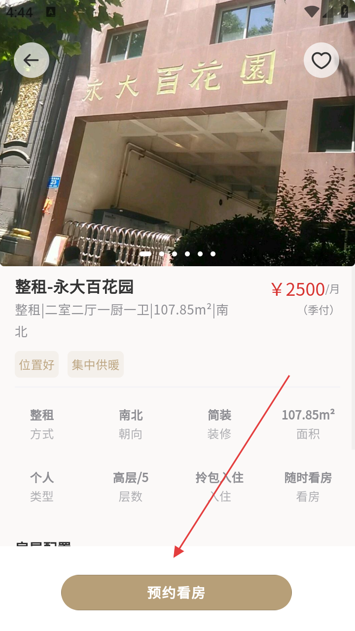 3、查看房源信息(面积、户型、价格),若想看房,点击【预约看房】。