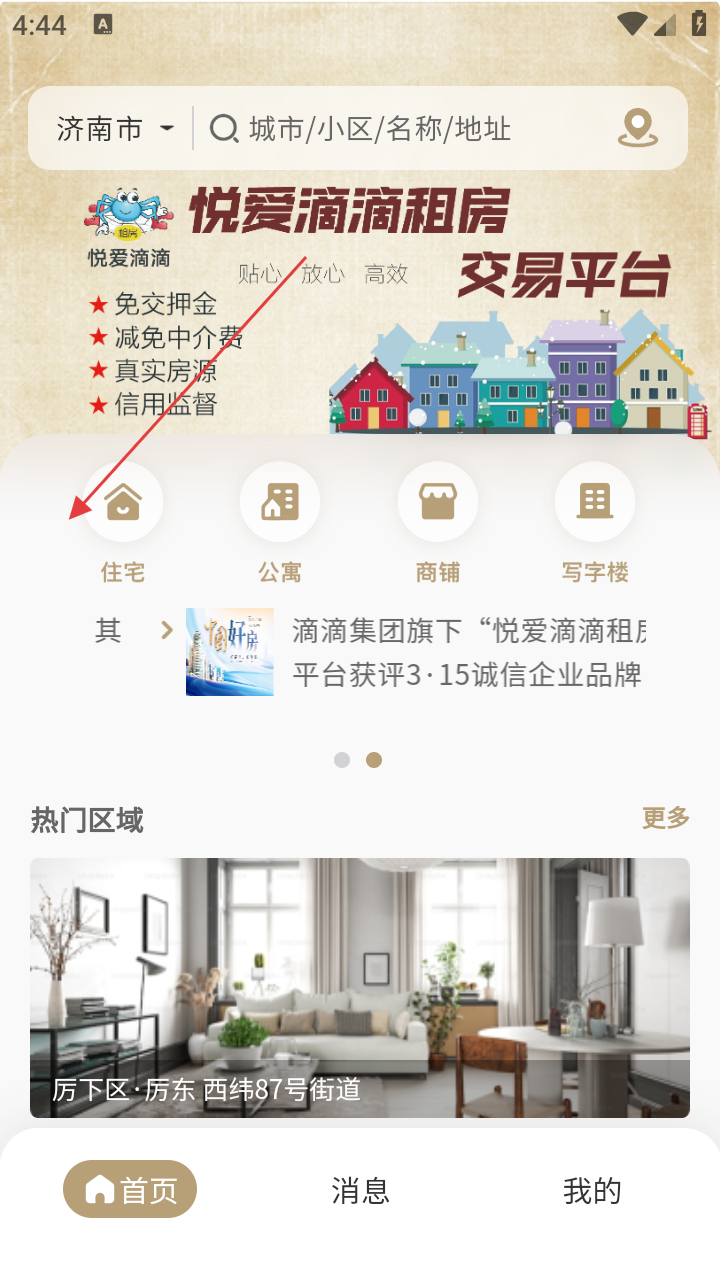 1、打开悦爱滴滴租房首页,点击【住宅】,进入住宅房源列表页。