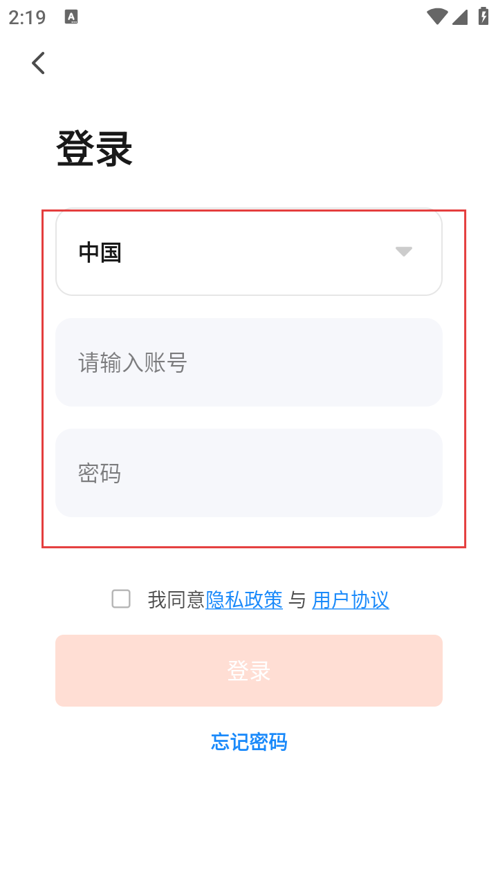 3、在登录页,选择地区后,填入【账号】和【密码】信息。