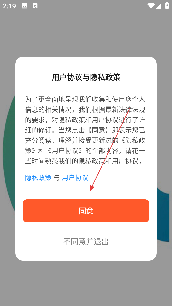 1、弹出【用户协议与隐私政策】弹窗,点击【同意】继续使用。