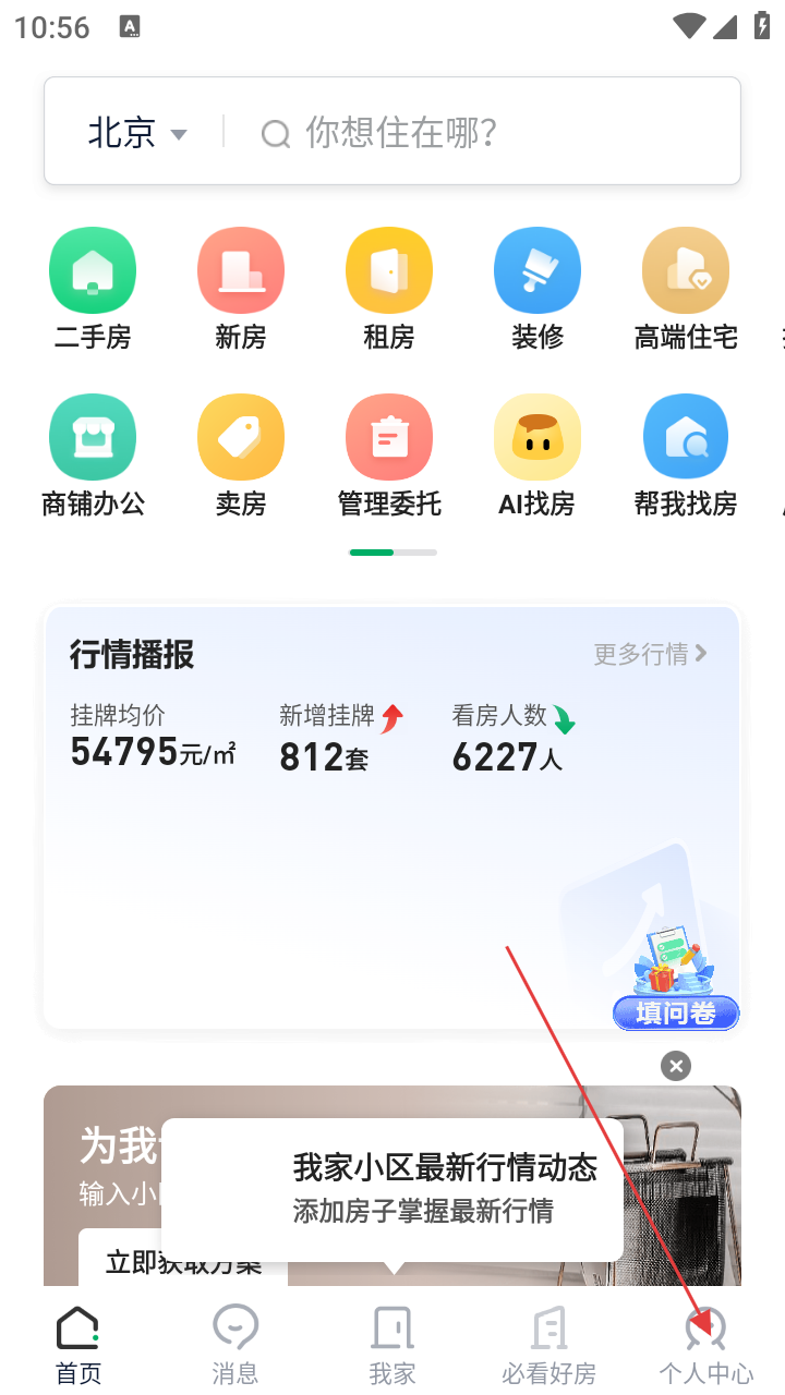 1、在链家首页,点击底部的【个人中心】选项,进入个人中心页面。