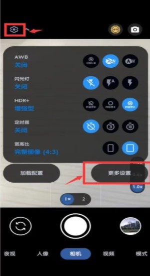 2、展开AWB与HDR+增强开关,设4:3画幅关闭闪光灯防过曝。