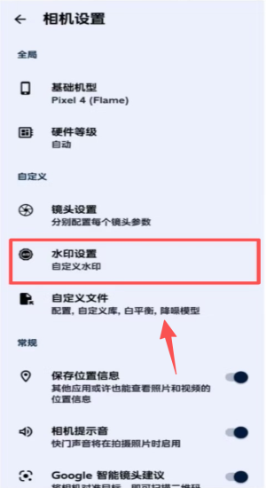 3、进入相机设置选Pixel机型,开启镜头自定义与水印自定义。